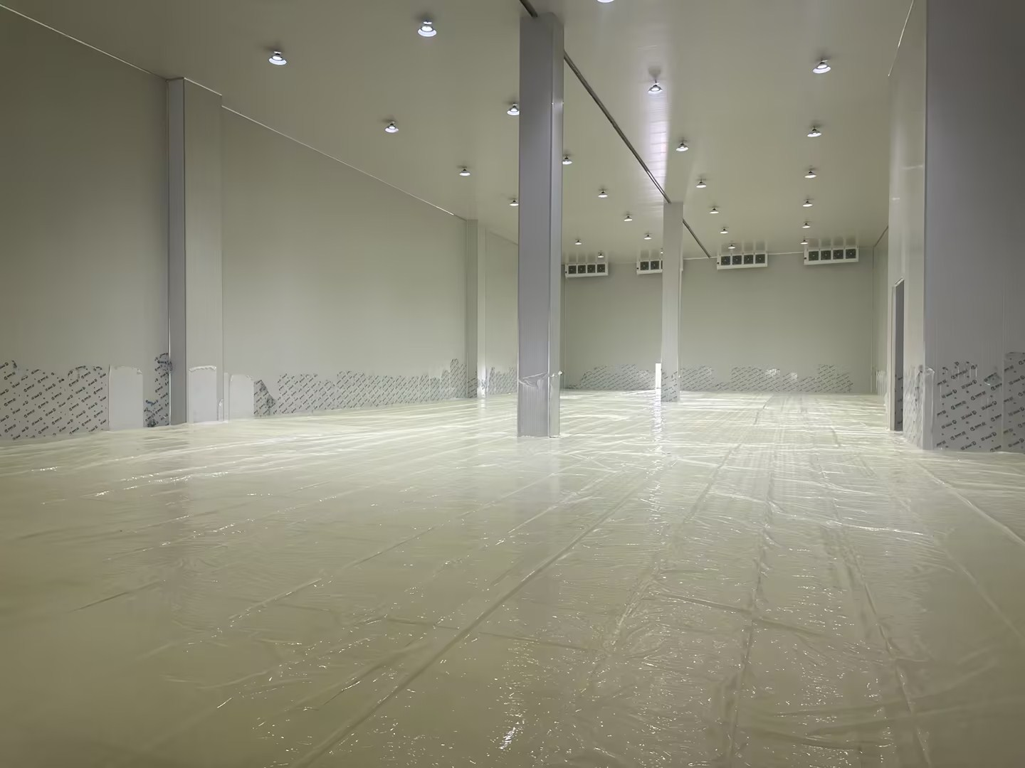 在冷庫庫板做好后,開始做地面,首先把地基夯實,并用自來水澆灌全部浸濕,干后再夯實,鋪一層石頭,倒一層水泥找平。一般大型冷庫的地板都要做成鋼筋混泥土,防潮防水的保溫地面,地面強度要求叉車能自由進入行駛裝貨卸貨。然后冷凍庫一般鋪入5公分的擠塑板三層,約十五公分的保溫層,保鮮庫一般鋪入5公分的擠塑板兩層,約十公分的保溫層,擠塑板要錯位交叉,縫隙之間要填實填滿。